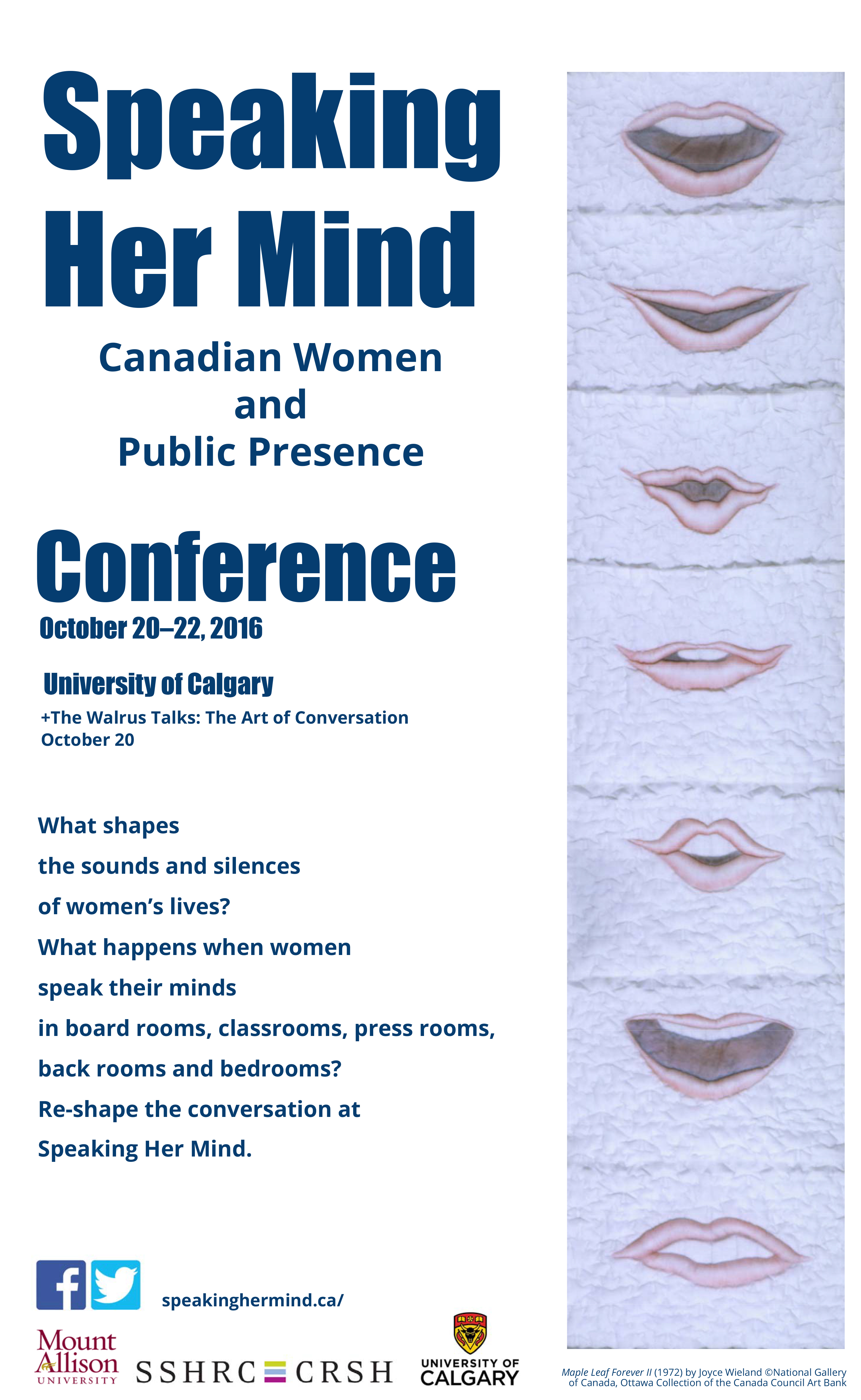 Speaking Her Mind was a 2016 conference at the University of Calgary, the follow-up to 2014’s Discourse & Dynamics. Featured Speakers Program Share this: Click to share on X (Opens in new window) X Click to share on Facebook (Opens in new window) Facebook Like Loading...
